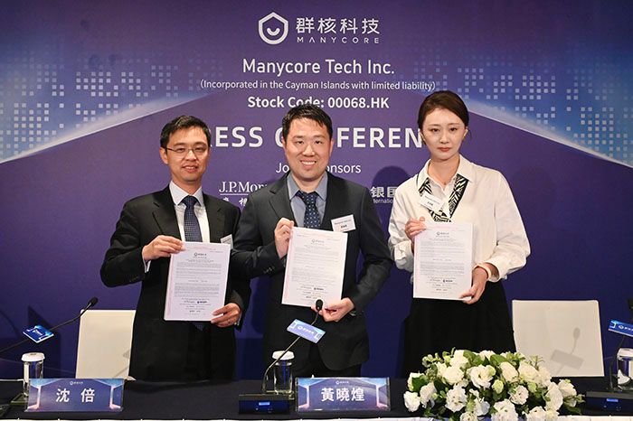 4月9日,群核科技在香港举行全球发售新闻发布会。图为群核科技联合创始人兼董事长黄晓煌(中)等出席新闻发布会。(图/中新社)