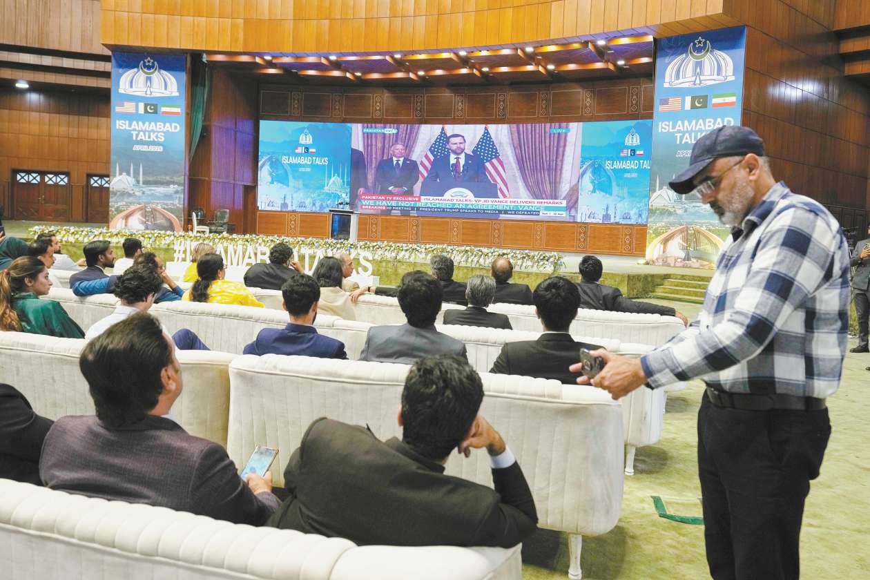 12日,伊斯兰堡,报道美伊谈判的记者在媒体中心观看美方召开的新闻发布会。(视觉中国)