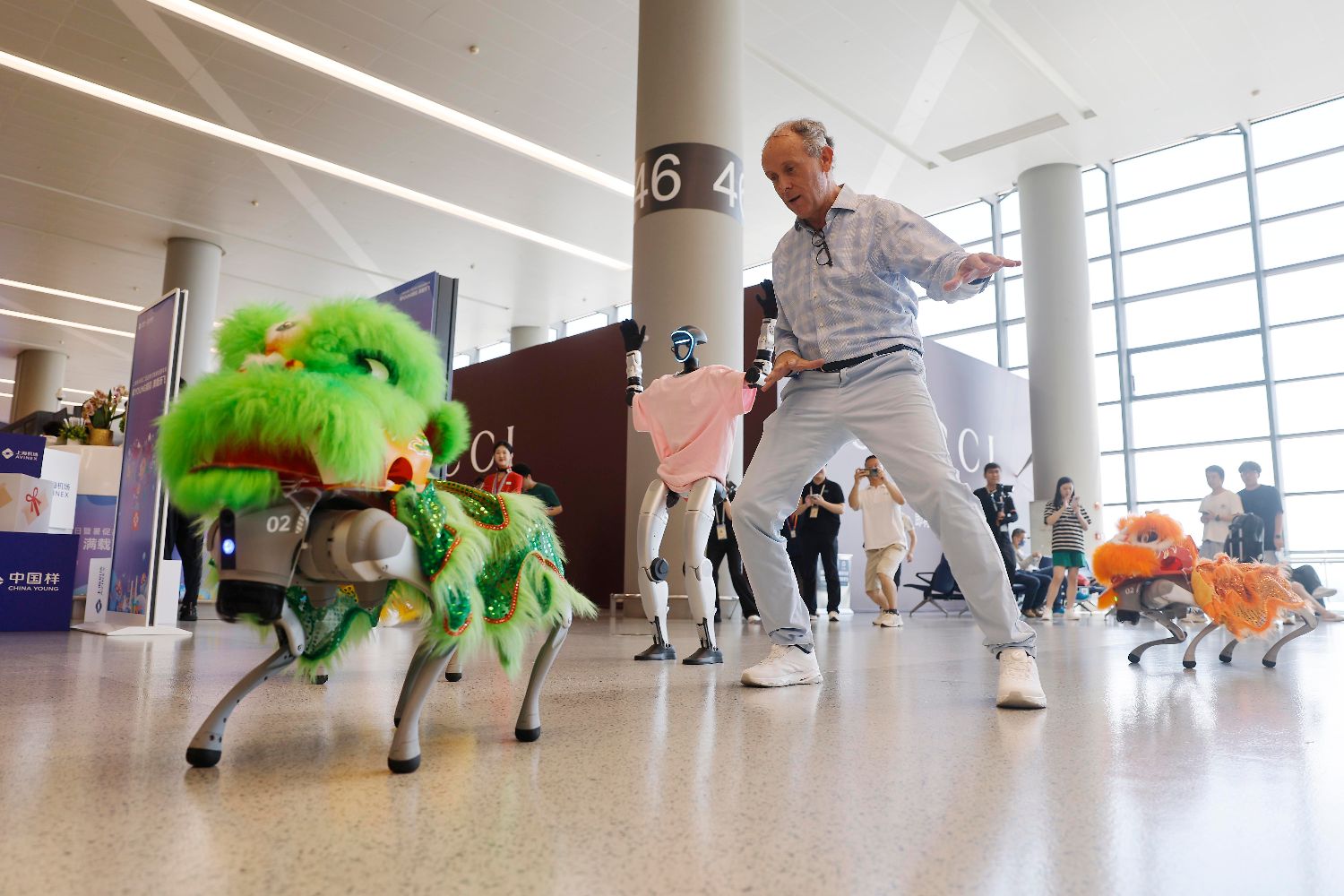 2024年6月29日,上海虹桥国际机场,旅客与“机器狗”共舞。当日,上海机场集团推出一系列“文化+商业+服务”系列活动,为旅客提供更具人文气质和服务品质的出行体验。(图/中新社)