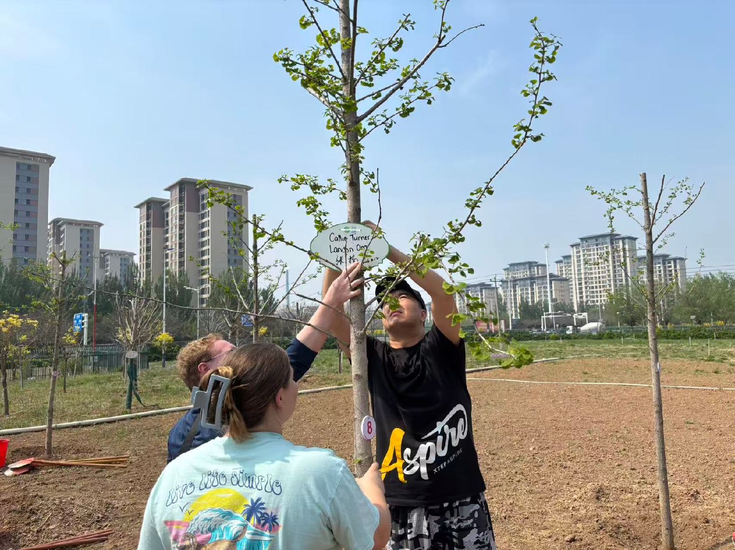 4月12日在河北省园博园的中美友谊传承青年林内,西卡罗莱纳大学学生兰登·奥尔和同伴挥锹培土、扶苗定植、提桶浇灌,为这片土地新植下一批银杏树幼苗。