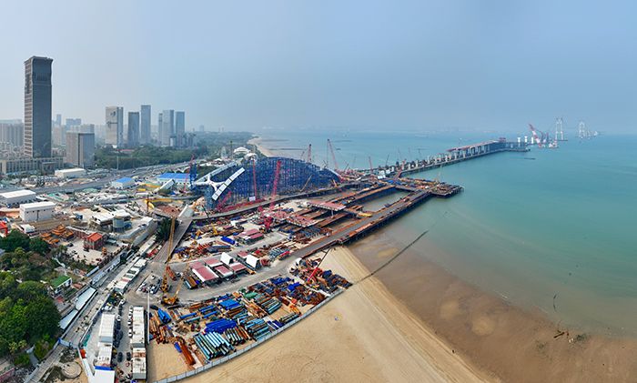 图为3月29日,俯瞰厦金大桥(厦门段)工程建设现场。 (图/中新社)