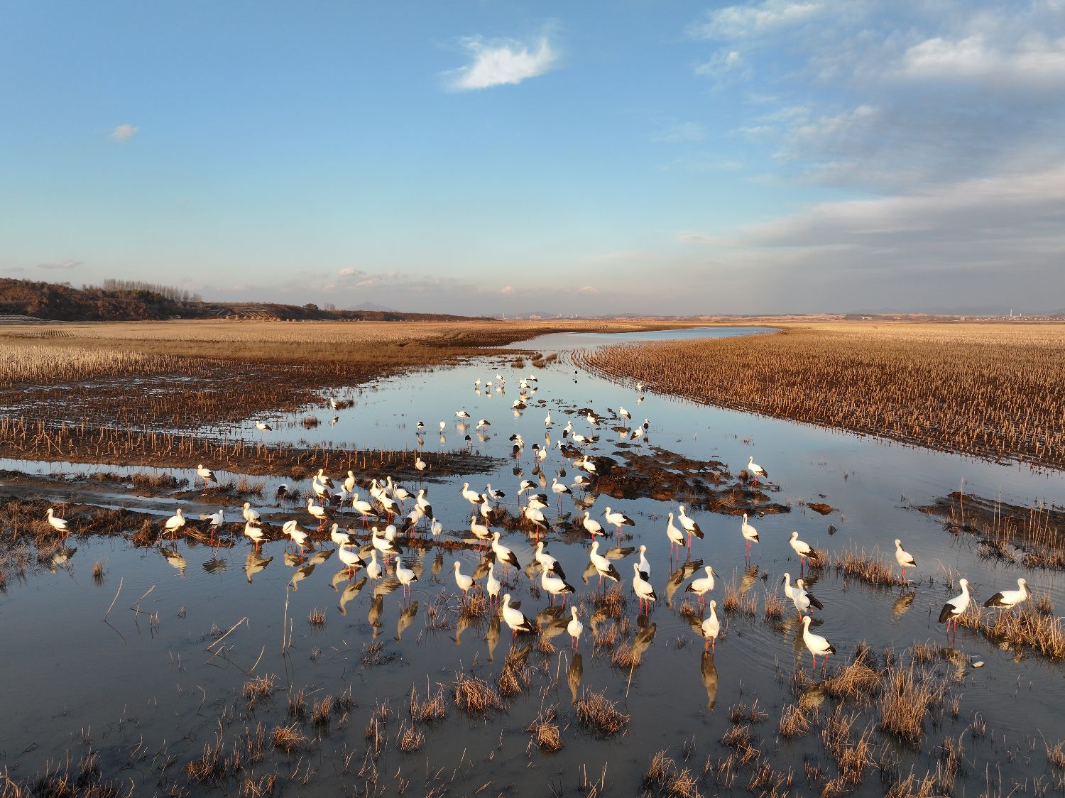 2025年11月10日,吉林蛟河,大量东方白鹳在湖边、田野栖息。东方白鹳是国家一级保护动物,被誉为“鸟中国宝”。(图/中新社)