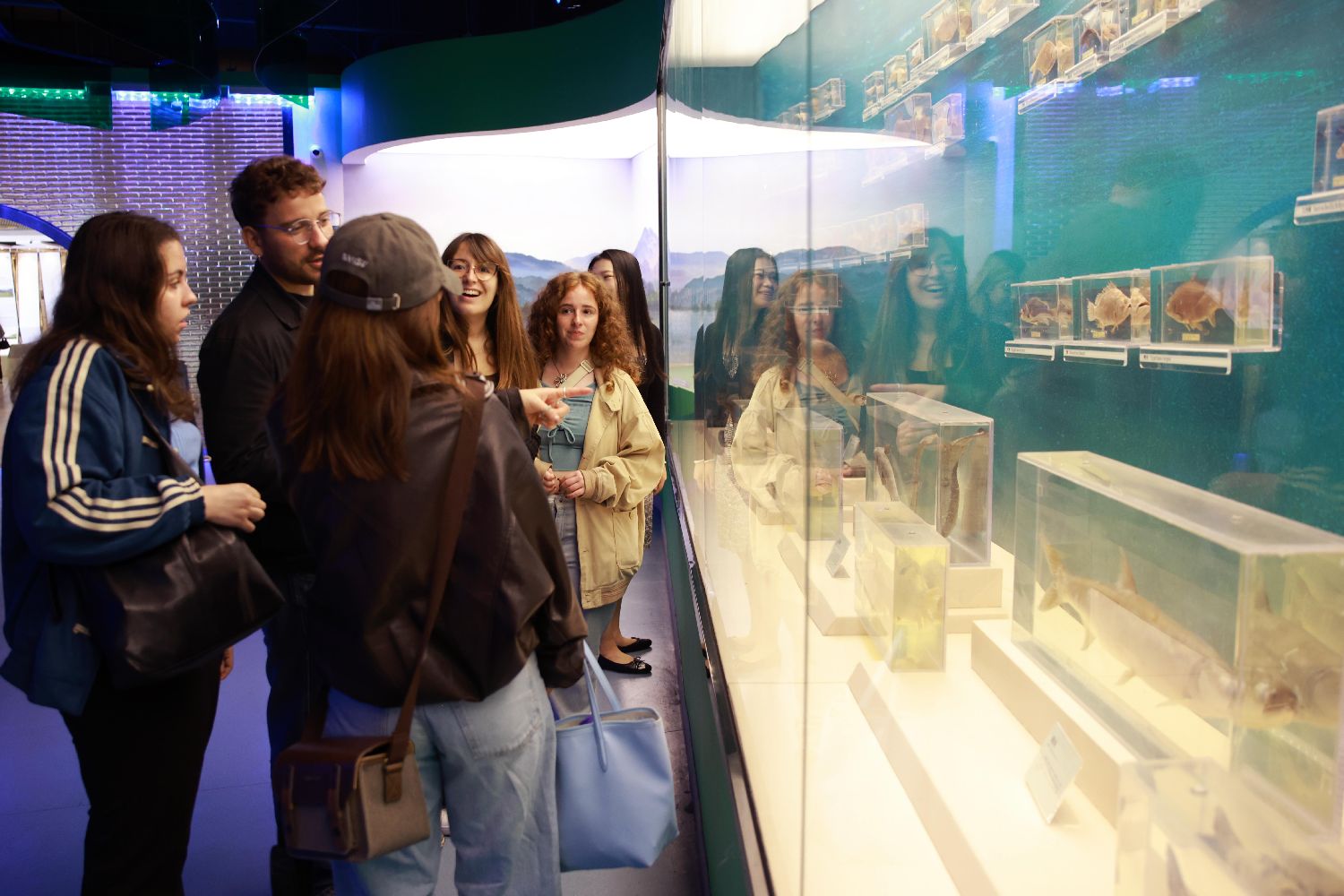 4月12日,留学生在位于浙江丽水青田的稻鱼共生系统博物馆驻足观看瓯江水生生物标本。(图/中新社)