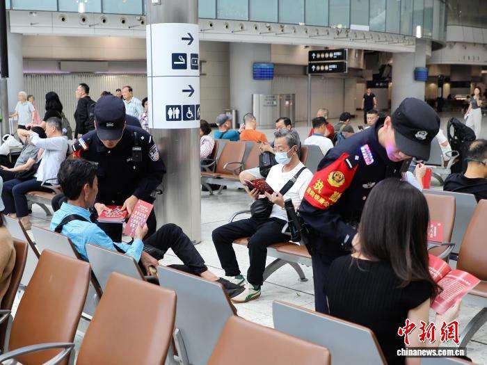 西九龙站派出所警员在候车室内开展国家安全普法宣传。(图/中新网)