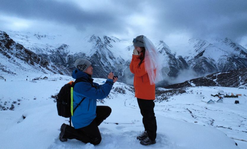 北京时间4月12日凌晨,四姑娘山大峰下方、海拔4648米的雪山上,寒风凛冽,气温低至零下10℃。来自安徽的小伙张先生单膝跪地,在稀薄的空气中掏出戒指,向女友周女士说出那句酝酿已久的话:“亲爱的,嫁给我好吗?”周女士双眼含泪,坚定地回答:“我愿意。”