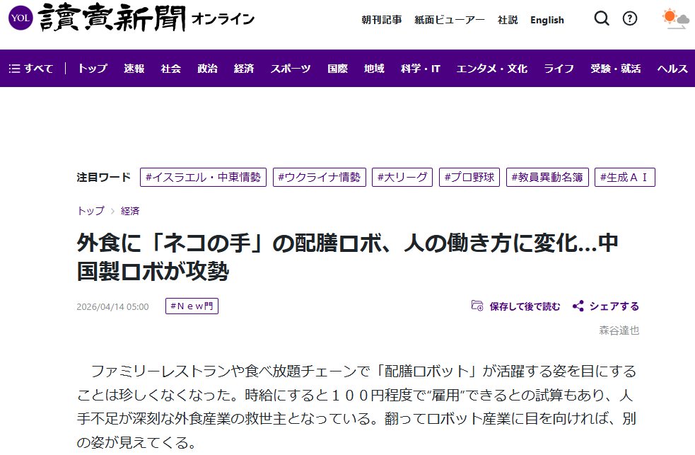 早稻田大学机器人工学教授高西淳夫指出:“中国将送餐机器人等投入大量实际运用场景,在反复试错中积累了海量数据。日本在养老护理、防灾等领域也有机器人可以大显身手的空间,需要通过产学合作持续推进研发。”