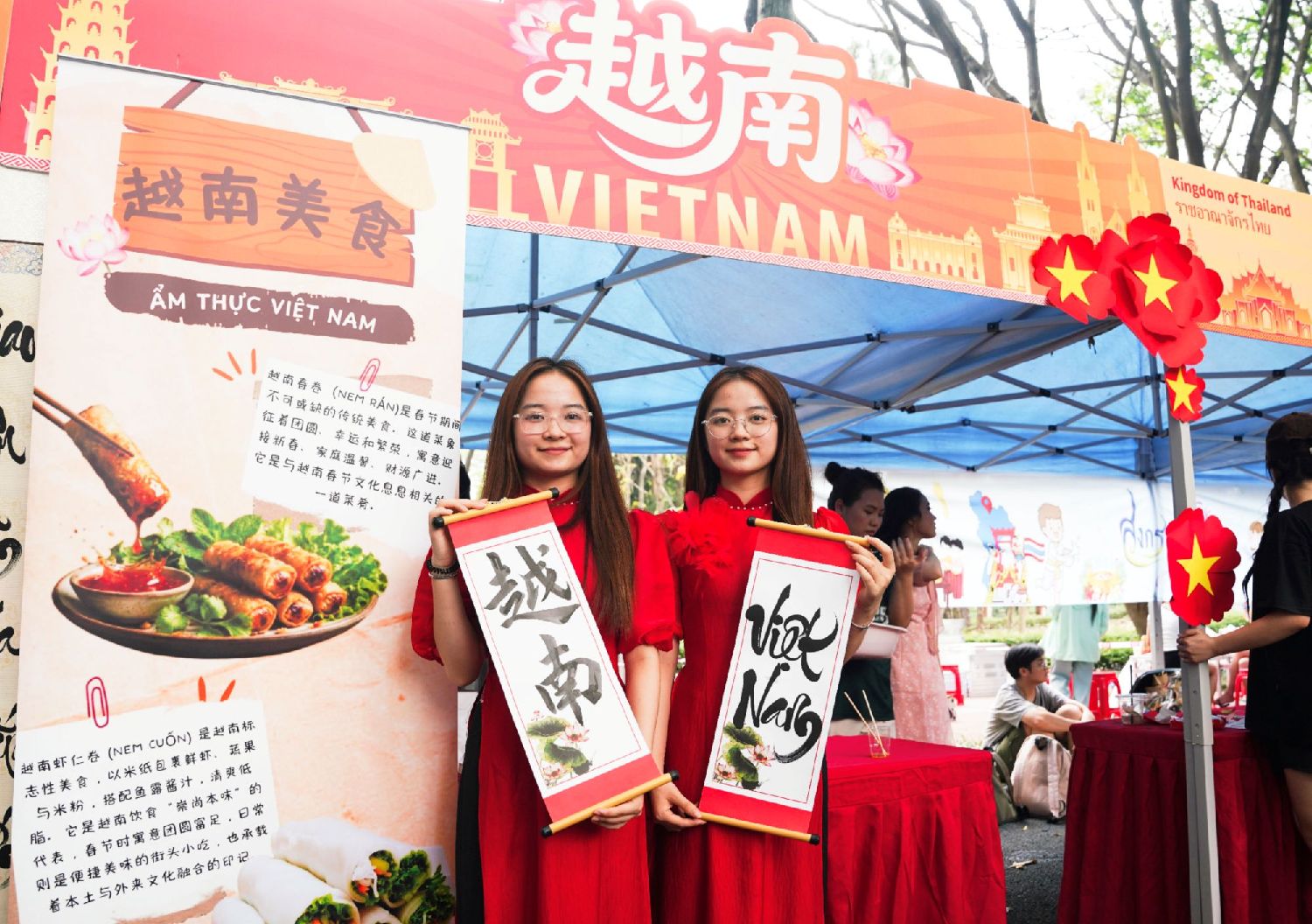 4月14日,广西南宁市,越南留学生阮玉英(右)和阮玉映在广西民族大学2026年国际文化节活动上合影。(图/中新社)