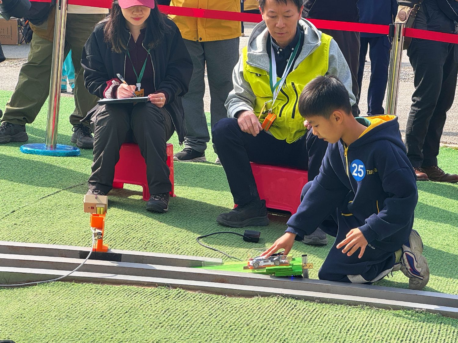 “团队拼装竞速赛”后半阶段为竞速比赛,图为选手将四驱车放入起点,准备开赛。(凉子摄)