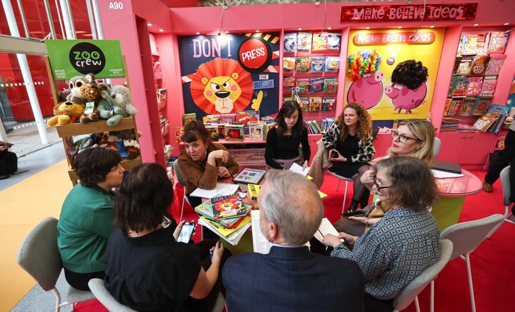 4月14日,在意大利博洛尼亚,参展商在第63届博洛尼亚国际儿童书展上交流。(新华社)