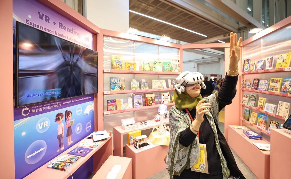 4月14日,在意大利博洛尼亚,观众在第63届博洛尼亚国际儿童书展上体验虚拟现实阅读设备。(新华社)