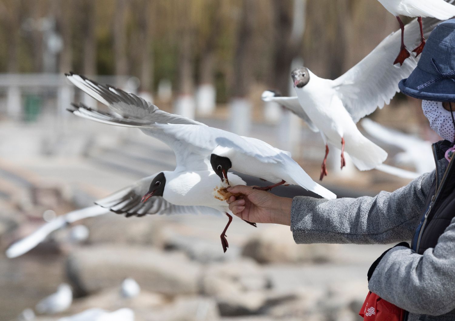 3月18日,宁夏银川北塔湖边,市民与红嘴鸥等候鸟互动。有“塞上湖城”之称的银川市拥有5.3万公顷湿地与近200个自然湖泊、沼泽湿地,是东亚—澳大利西亚候鸟迁飞路线上的重要驿站。(图/中新社)