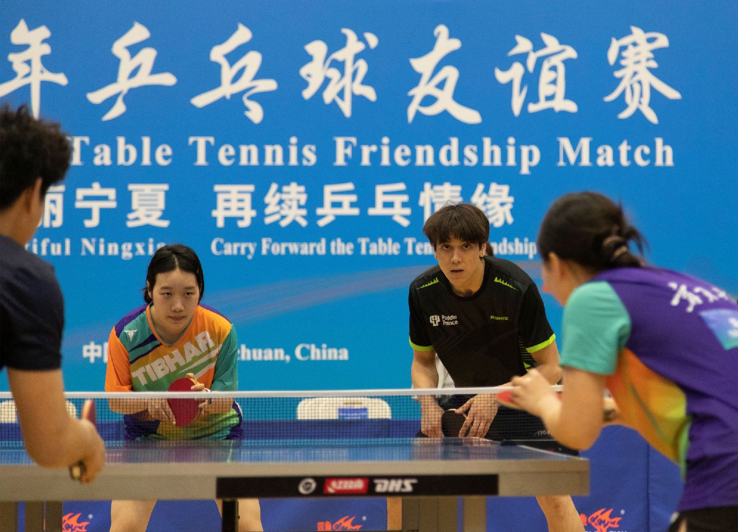 4月16日,“相聚美丽宁夏再续乒乓情缘—中美青年乒乓球友谊赛”在宁夏体育馆举行。(图/中新社)