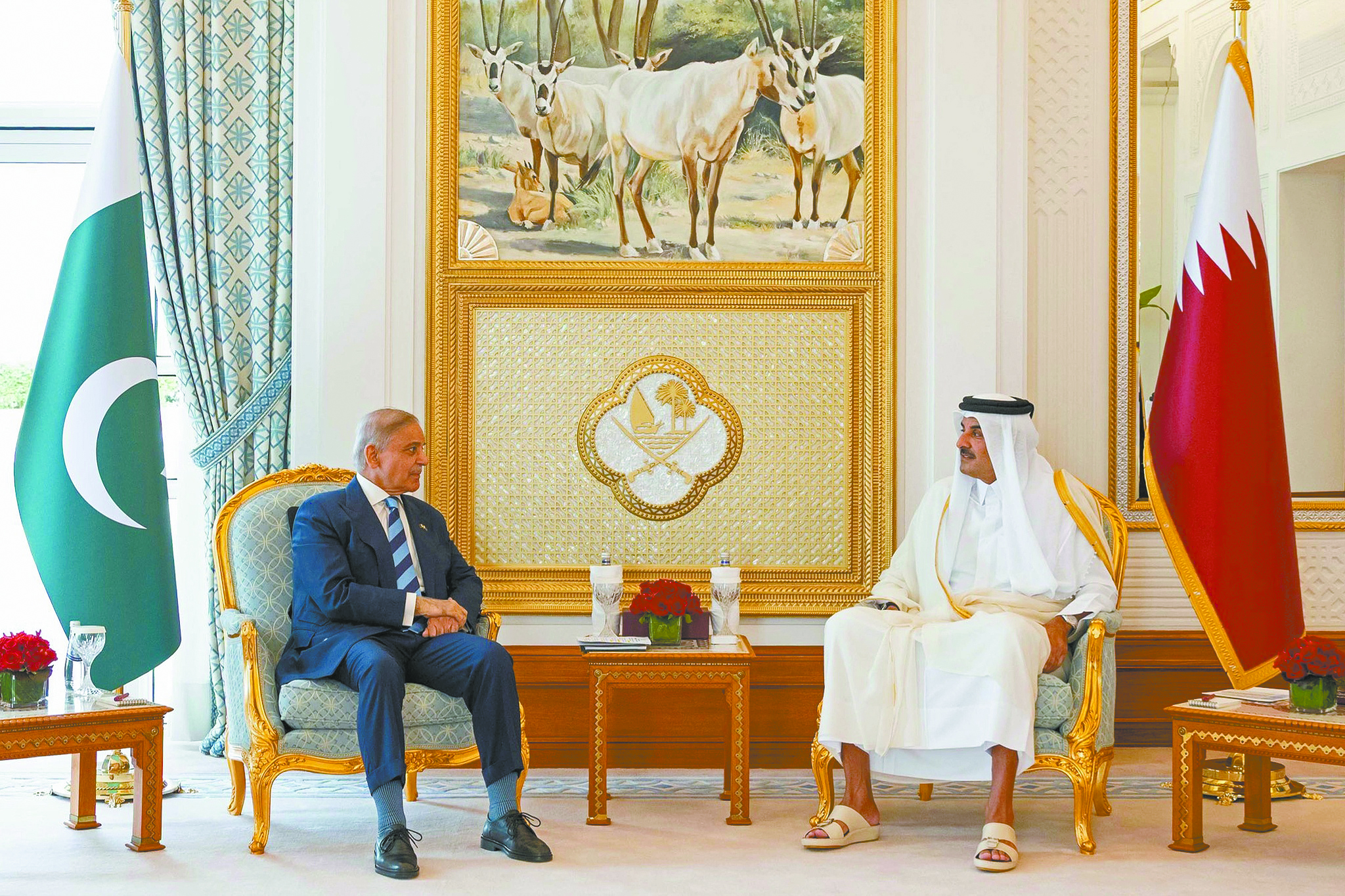 16日,巴基斯坦总理夏巴兹抵达卡塔尔首都多哈,与卡塔尔埃米尔塔米姆举行会谈。(视觉中国)