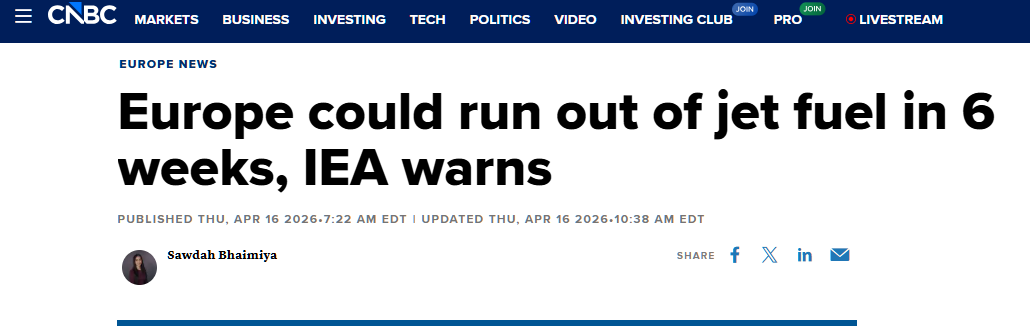 据CNBC报道,国际能源署(IEA)发出警告,欧洲航空燃油库存最快六周内将告罄,正值欧洲航空业进入夏季出行旺季,这一危机对欧洲经济的冲击正在迅速显现。
