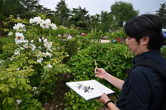 时值农历三月初三,位于邙山腹地的国家牡丹园内花海如潮、花香四溢。花丛前,书画家们拿出速写本,以水墨、水彩、速写等形式,在花香中开启“沉浸式”创作。团内很多台湾成员,是第一次到洛阳采风写生。