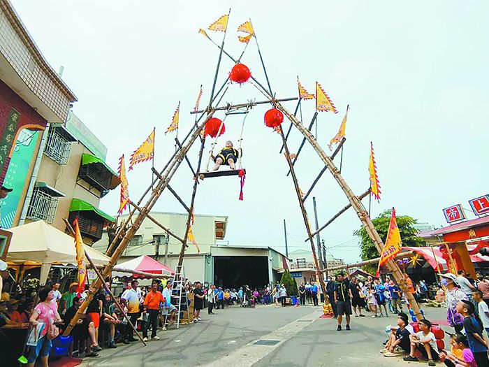 嘉义市秋千节18日在光路里武当山玄天上帝庙埕热闹举办,图为青年组选手比拼荡出最高度。(图/台北《中国时报》)