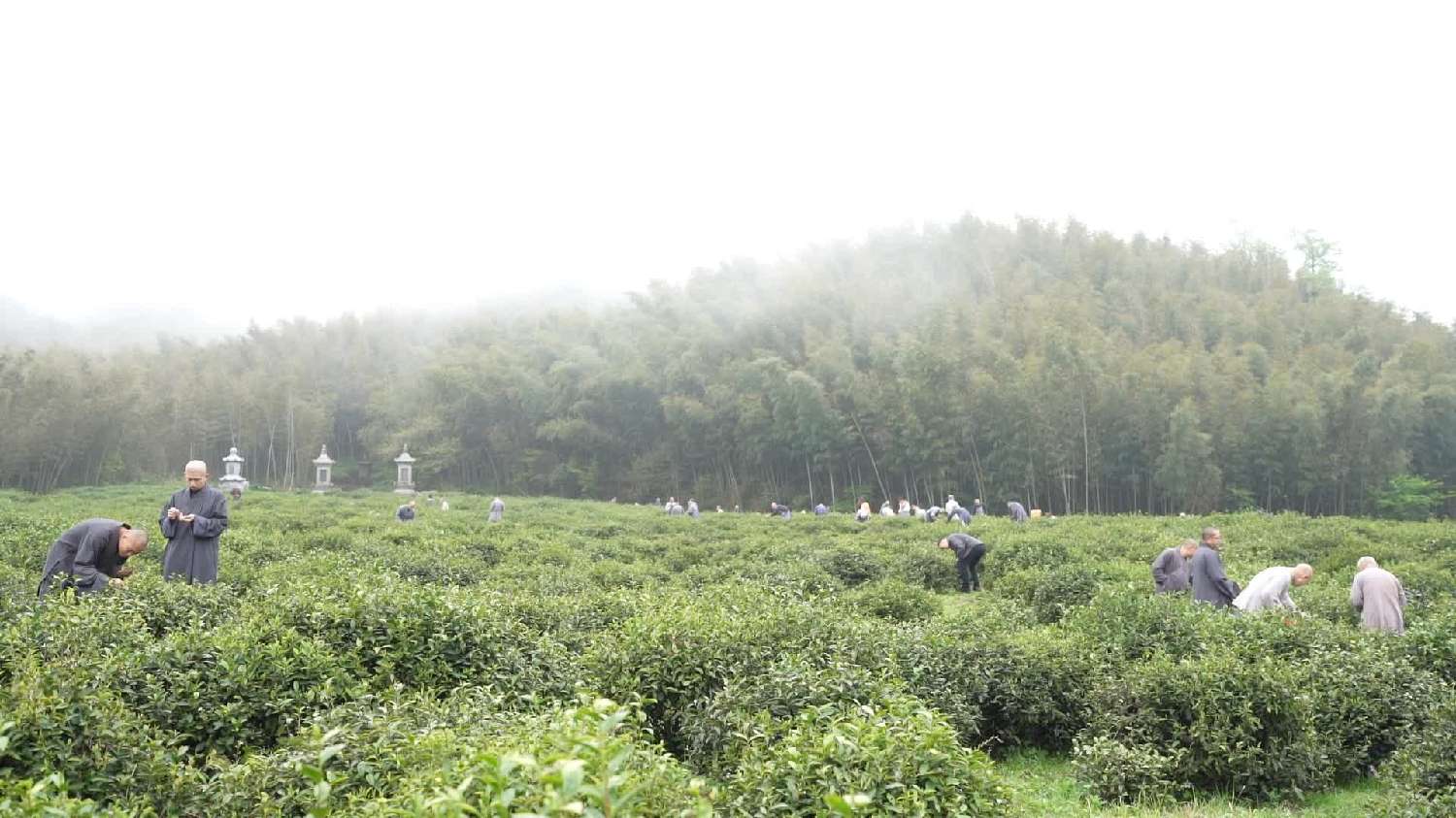 4月17日,江西永修,在千年古刹真如禅寺周边的上百亩茶园里,全寺上下“出坡”采茶。(图/中新社)
