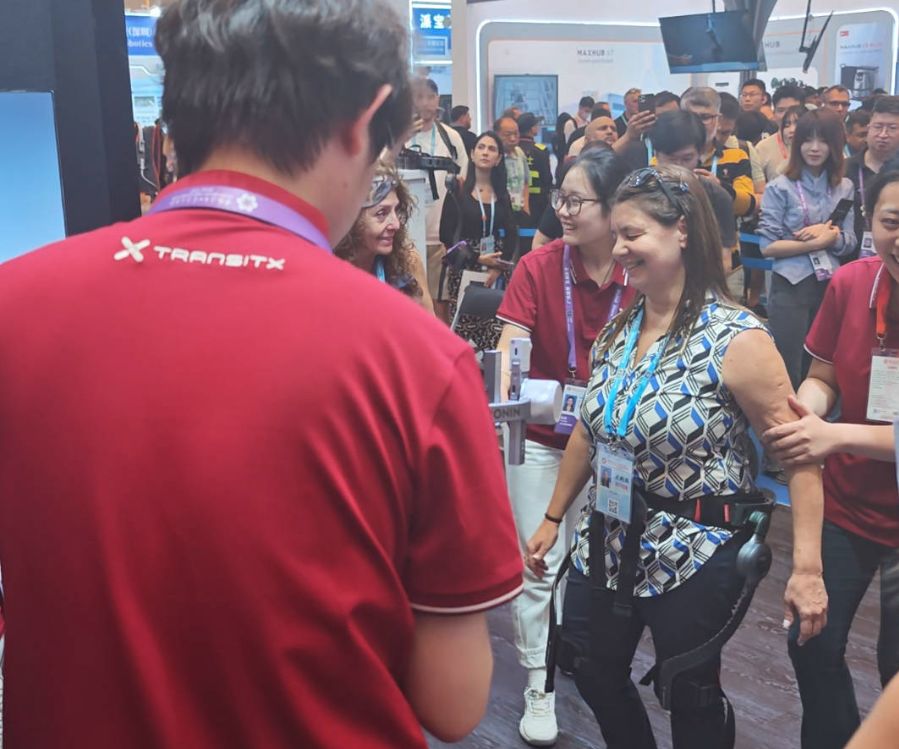 “她坐着电动轮椅过来的,下车的时候,是亲友和我们工作人员一起帮忙扶下来的。”4月21日,该公司品牌总监张卫介绍称,这位女士穿戴好外骨骼智能设备后,最先只是非常小心谨慎地尝试向前挪步,后来竟松开了同伴和工作人员的搀扶自己独自行走,而且还转了两圈。“当时有很多外国采购商围观,看到这一幕大家就开始欢呼了,她的同伴,我猜可能是她的姐姐,已经是喜极而泣、热泪盈眶了。我们的工作人员赶紧递了纸巾,给了她一个拥抱。”