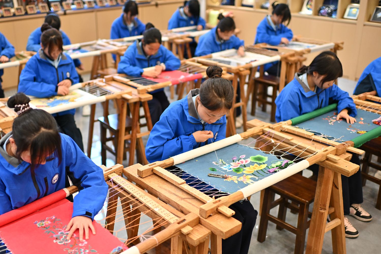 4月20日,学生们在秀山职教中心非遗文创基地学习苗绣。位于重庆市秀山土家族苗族自治县的秀山职教中心非遗文创基地,是以本土非遗为核心,打造集教学研修、文旅产品开发、传统技艺制作体验等多元功能于一体的公共文化传承平台。基地依托秀山职教中心办学资源,构建起完善的非遗传承体系,已建成龙凤花烛坊、非遗苗绣坊、西兰卡普织锦坊等14个细分非遗技艺传承工坊。同时,基地还邀请非遗代表性传承人驻校教学,将非遗技艺融入职业教育课程体系,推动非遗在校园实现活态传承、创新发展。(中新社)