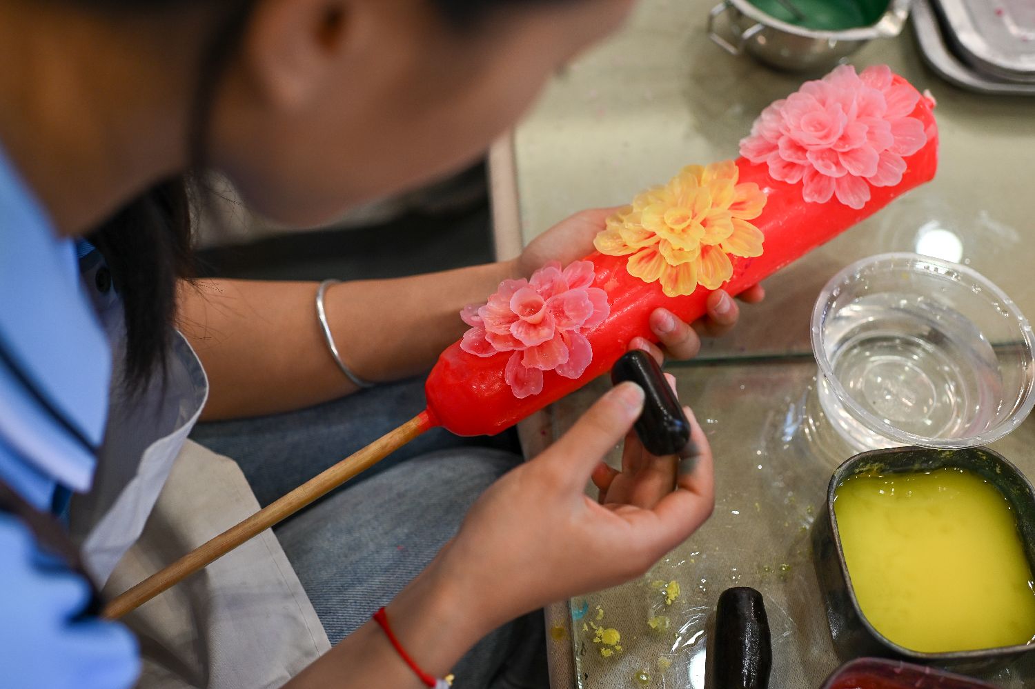 4月20日,学生们在秀山职教中心非遗文创基地学习制作花烛。(中新社)