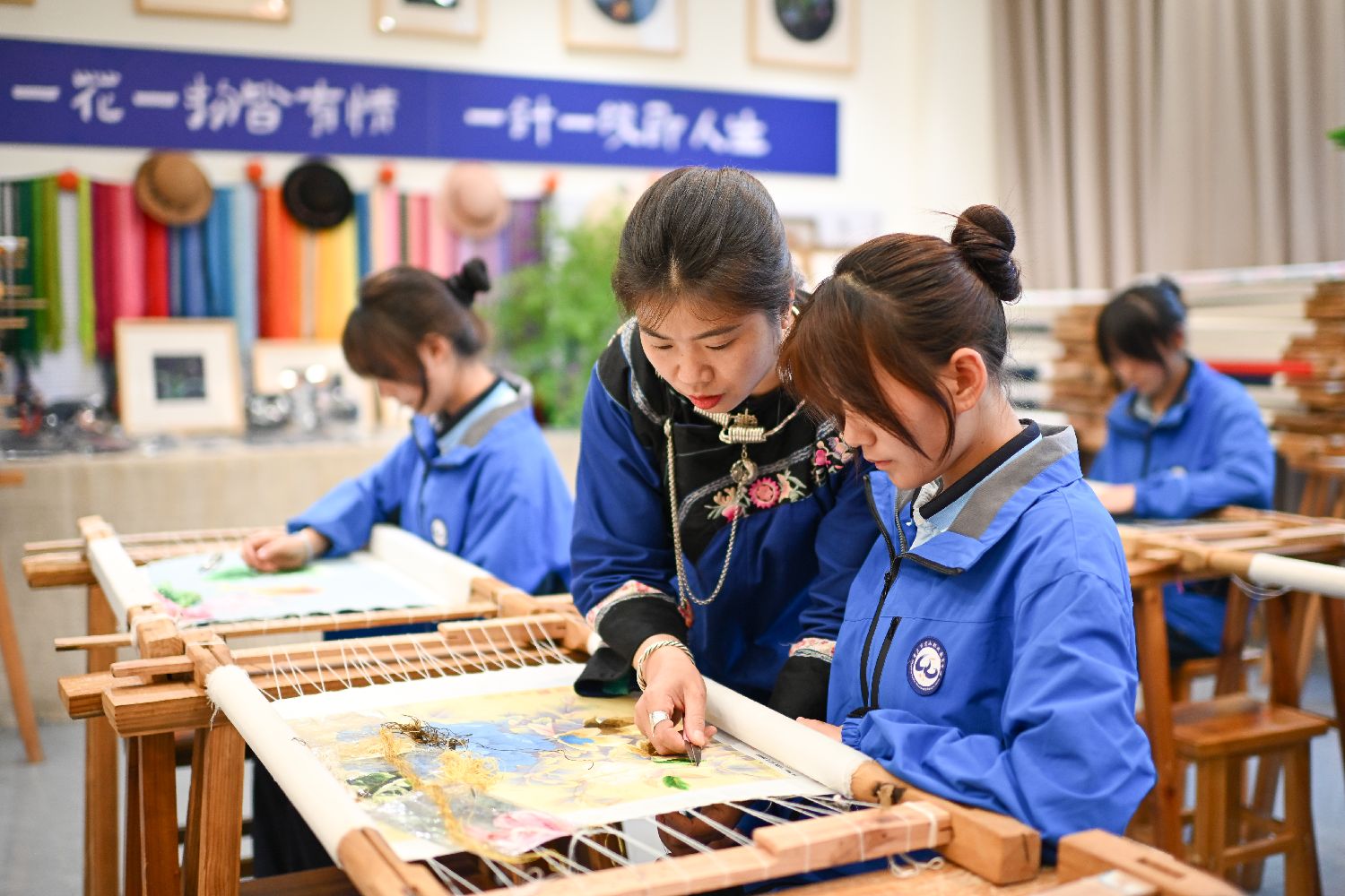 4月20日,在秀山职教中心非遗文创基地苗绣工坊,老师指导学生进行苗绣创作。(中新社)