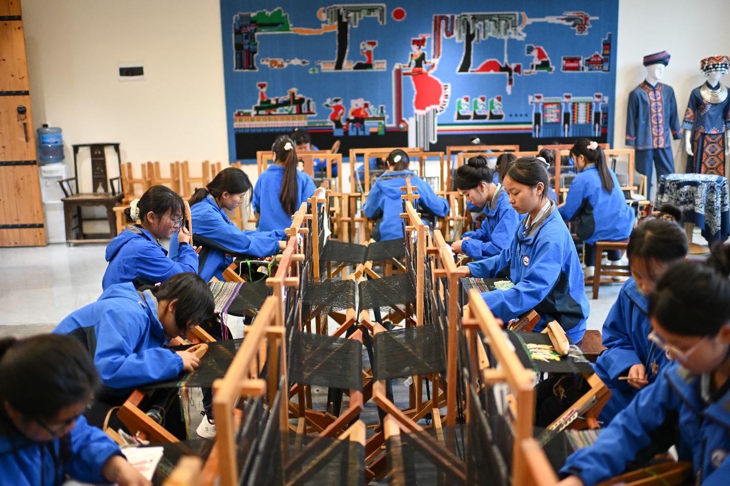 4月20日,学生们在秀山职教中心非遗文创基地学习土家织锦西兰卡普。(中新社)