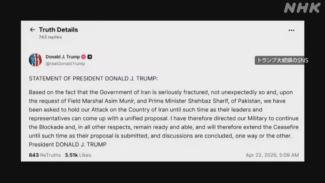 此前,美国与伊朗agreed的两周停战,原定于美国东部时间22日晚、也就是日本时间23日上午到期。特朗普在帖文中表示,在伊朗提出方案、并且磋商以某种形式得出结论之前,将继续维持停战,但并未说明具体延长到何时。