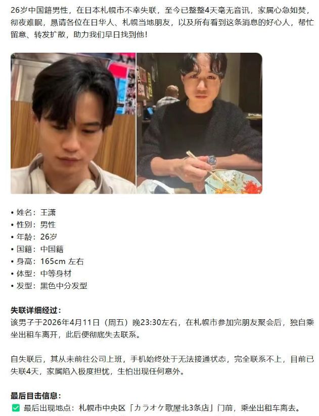 据寻人启事信息显示,王潇,身高165cm左右,中等身材,发型为黑色中分,于2026年4月11日23时30分左右,在日本札幌市参加完朋友聚会后,独自乘坐出租车离开,此后便彻底失去联系。自失联后,其从未前往公司上班,手机始终处于无法接通状态,家属完全联系不上。