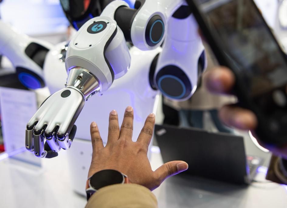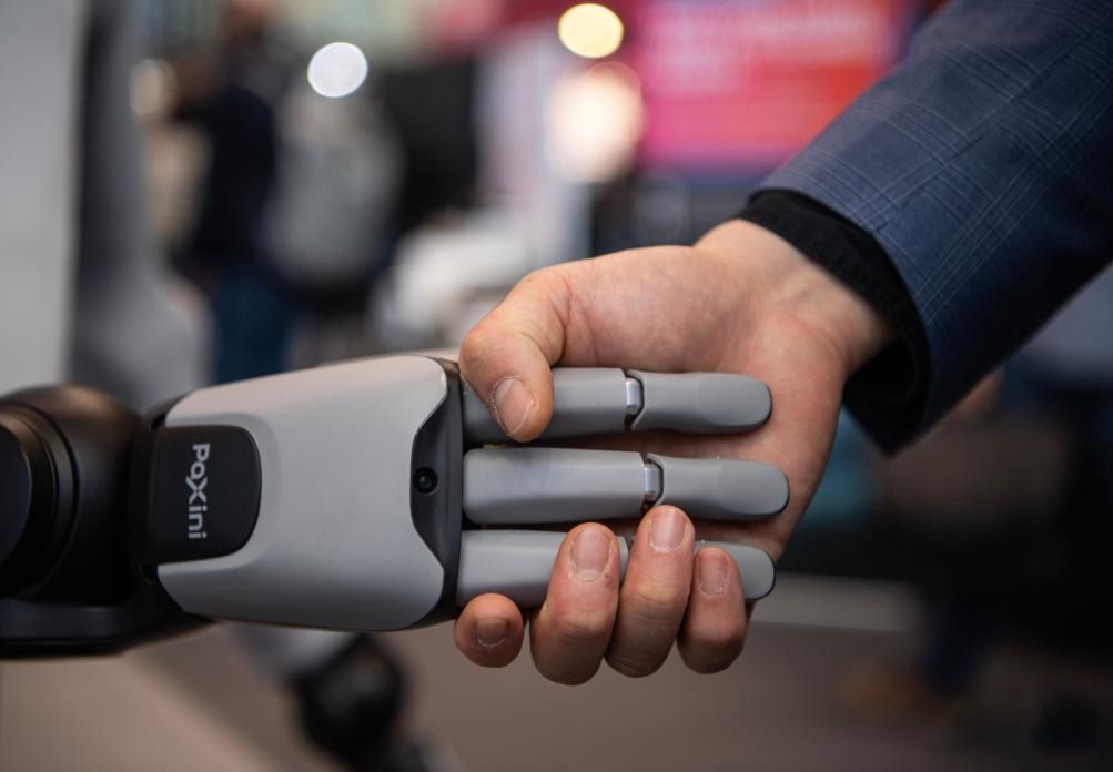 4月21日,在德国汉诺威工业博览会,一名男子与一款帕西尼人形机器人握手。(新华社)