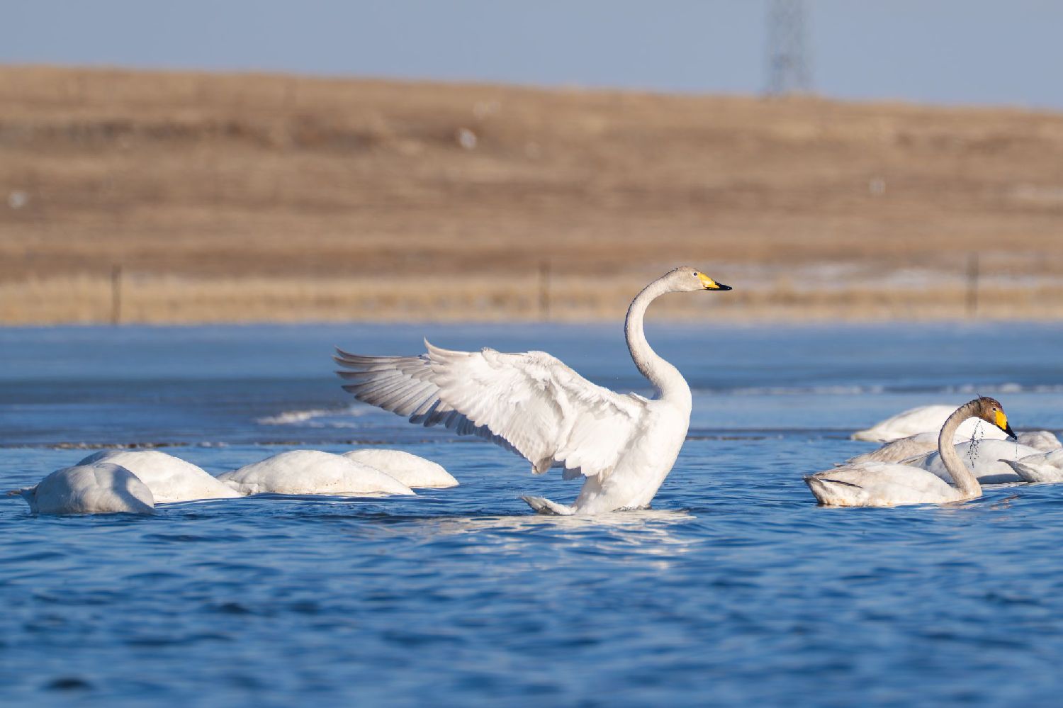 4月20日,内蒙古新巴尔虎右旗,大天鹅、小天鹅齐聚呼伦湖休憩、嬉戏。(图/中新社)