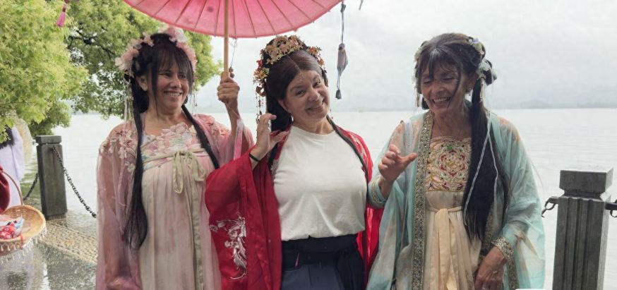 4月22日,杭州的雨一阵一阵地下,玛丽亚三人喜欢中国文化,又因为克拉拉的职业,想感受一次汉服妆造和阿根廷服饰的异同,于是都选了自己喜欢的汉服款式,做好自己喜欢的发型去逛西湖。