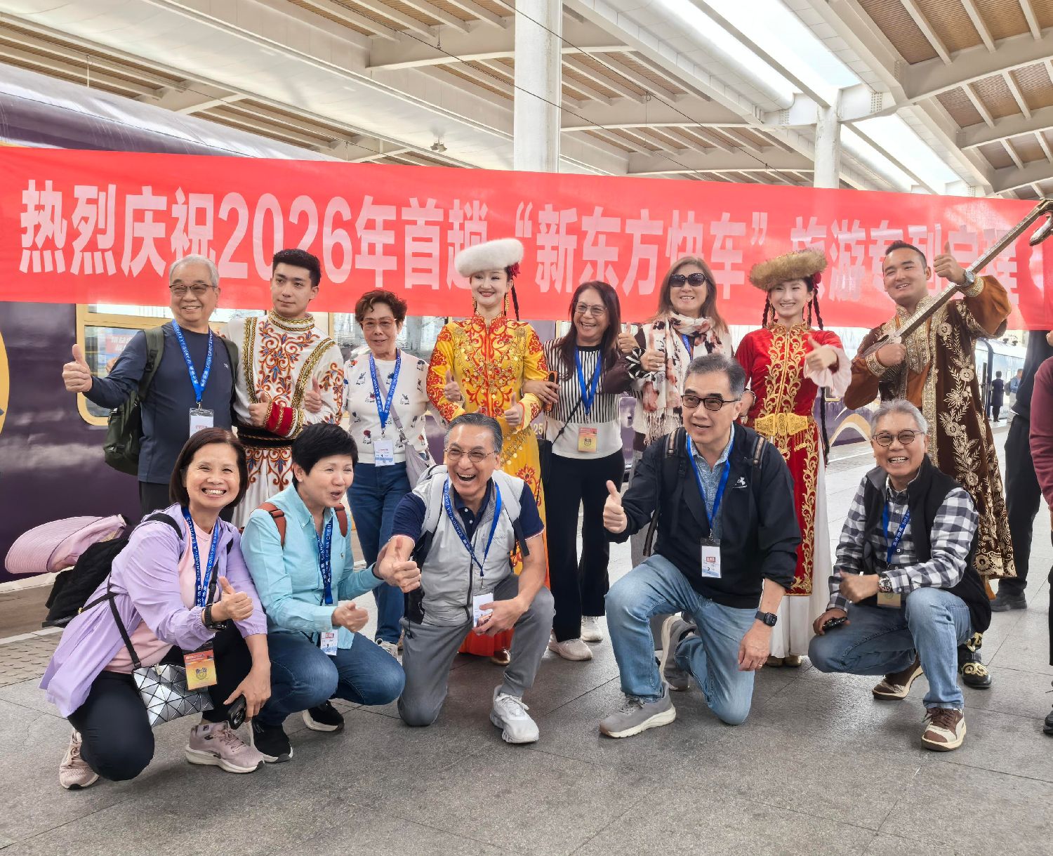 4月23日,乘坐2026年首趟“新东方快车”旅游专列的游客与新疆舞者在乌鲁木齐合影留念。(图/中新社)
