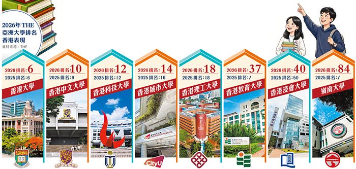 英国泰晤士高等教育23日公布的2026年亚洲大学排名显示,香港有8所大学跻身百强。(图/香港《文汇报》)