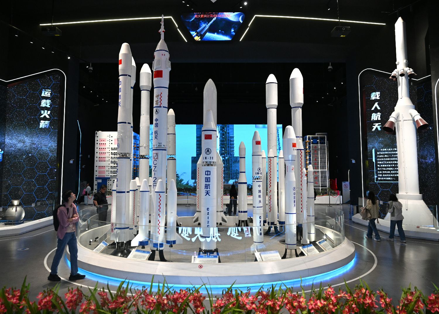 4月24日是第十一个中国航天日,恰逢中国航天事业创建70周年,位于北京的中国航天博物馆免费开放,吸引民众参观。图为运载火箭模型吸引参观者。(图/中新社)