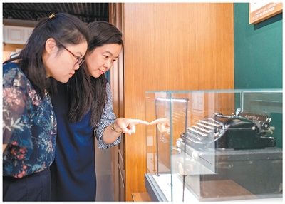 2025年9月19日,上海淞沪抗战纪念馆,观众正在参观中国检察官向哲濬参加东京审判时所使用过的老式打字机。