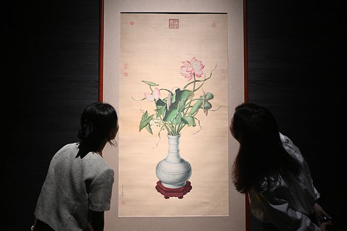 4月27日,两名女士观看清宫画家郎世宁所绘《池莲双瑞》。(图/中新社)