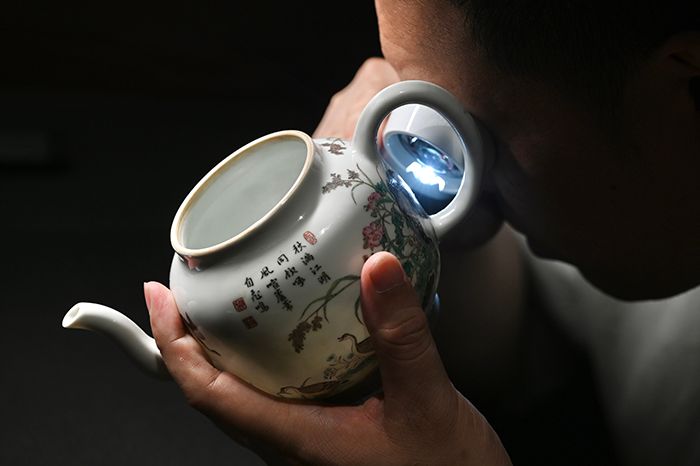4月27日,一名男士仔细观看清乾隆珐琅彩“飞鸣宿食”图茶壶。(图/中新社)