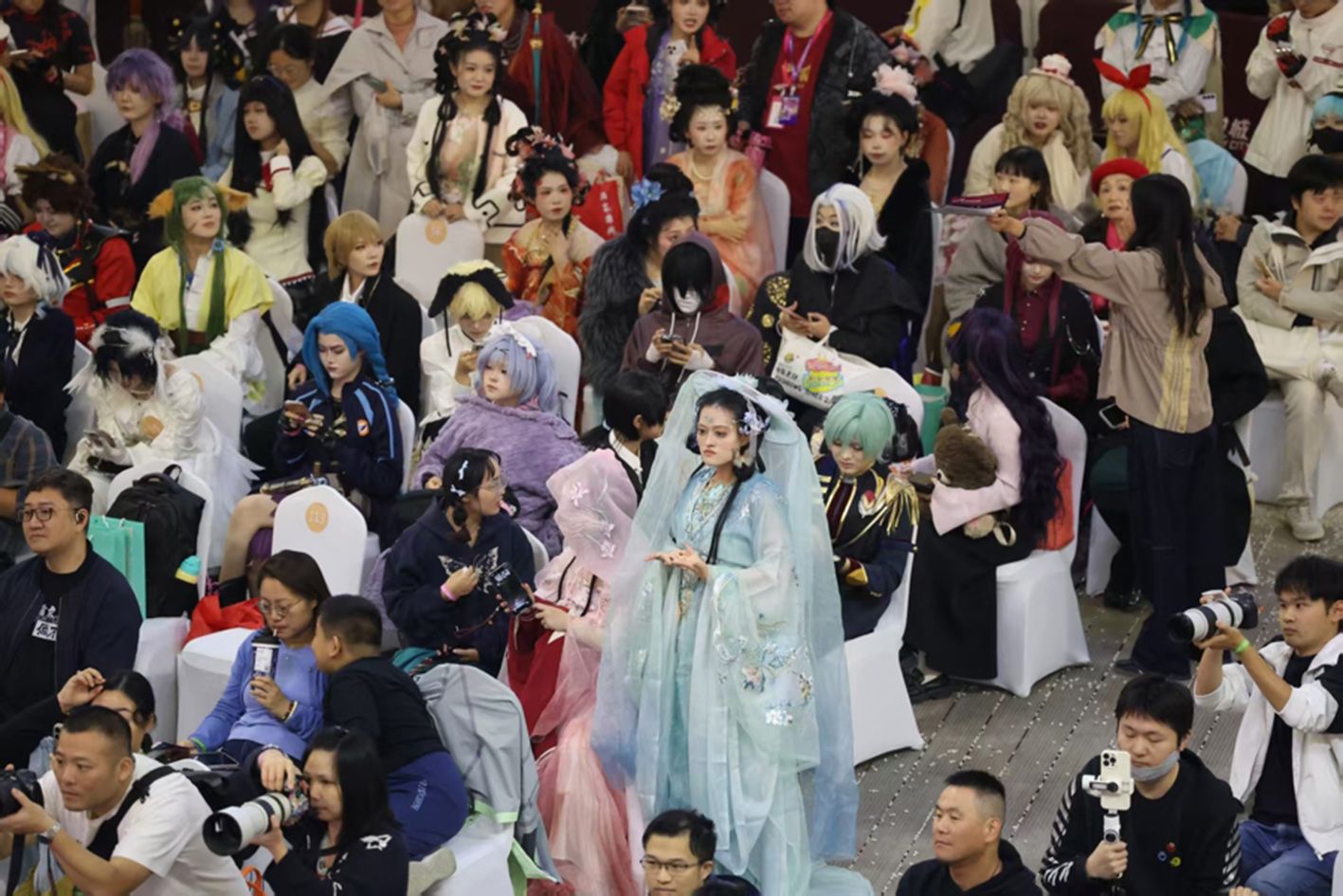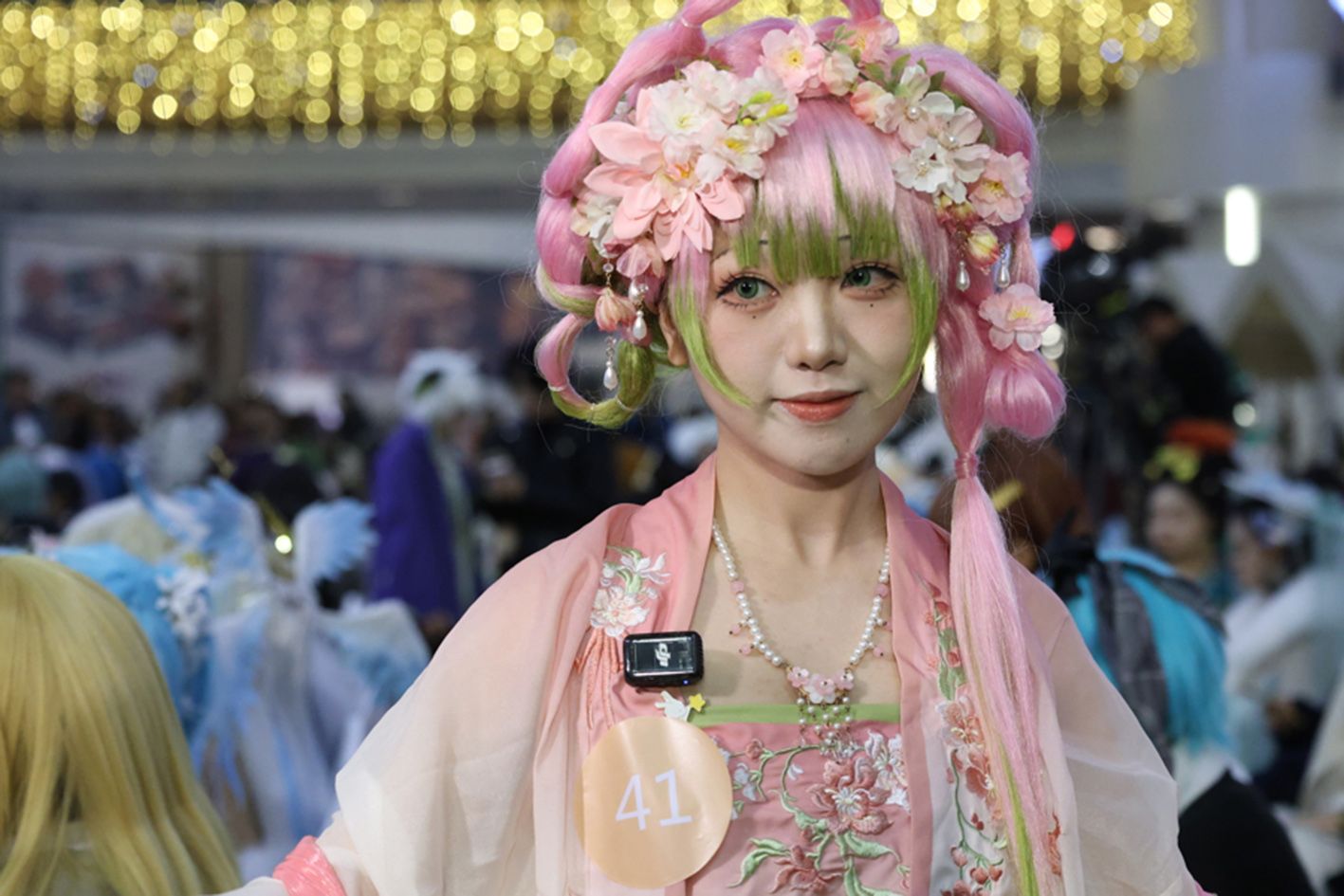 决赛现场,千余名妆造爱好者以“国潮+二次元”为灵感,展示国风造型、还原动漫角色等,将传统艺术与现代潮流融合,让观众沉浸式感受跨次元文化魅力。10月26日,参赛选手展示自己的妆造。(新华社)