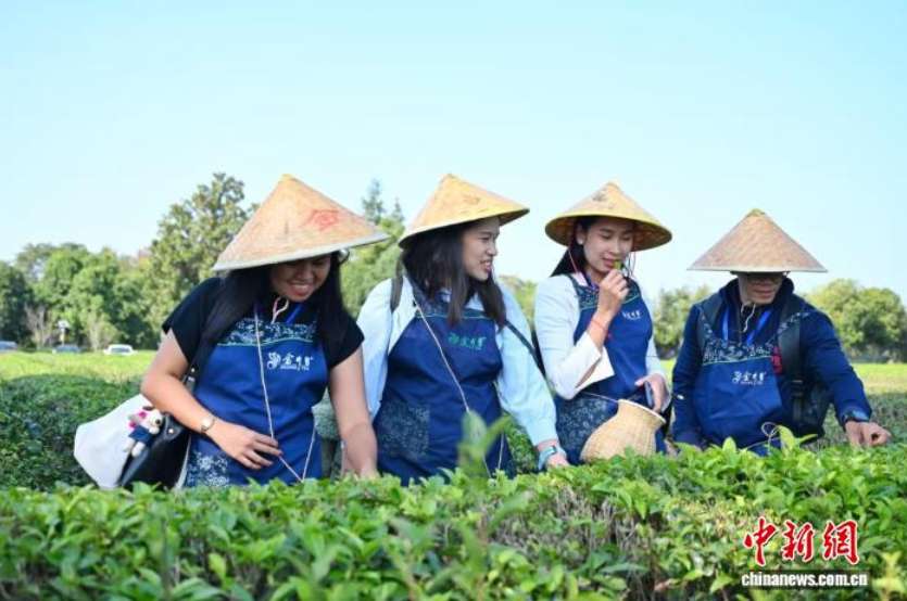 海外媒体代表体验采茶。(图/中新网)