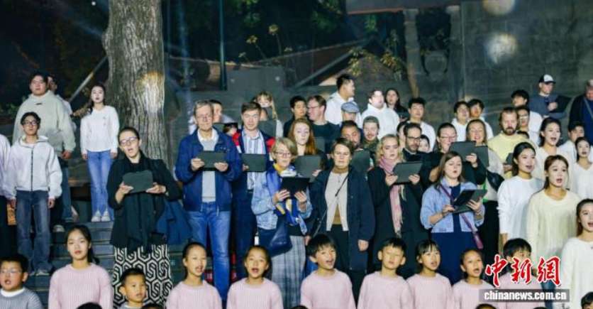 中外合唱团在汉阳门花园共唱武汉民谣。(图/中新网)