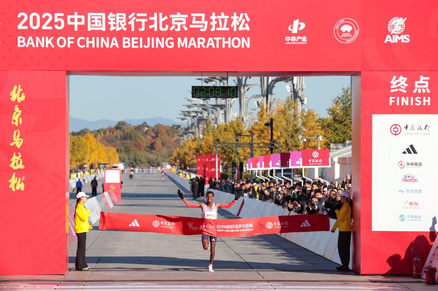11月2日,2025北京马拉松鸣枪开赛。图为埃塞俄比亚选手哈耶尔以2小时08分10秒夺得男子组冠军。(图/中新社)