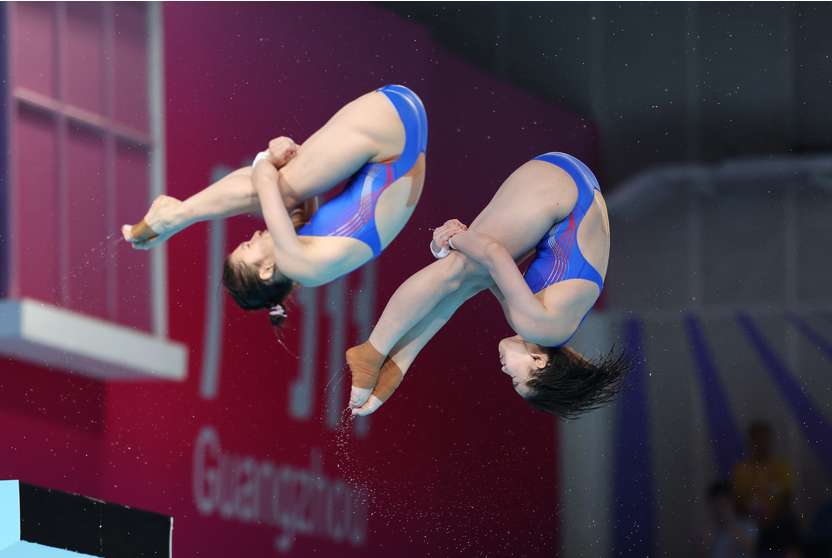 当地时间11月2日晚,十五运会跳水项目女子团体双人10米跳台比赛在广东奥林匹克体育中心举行。图为广东队的全红婵、王伟莹正在参赛。(图/中新社)