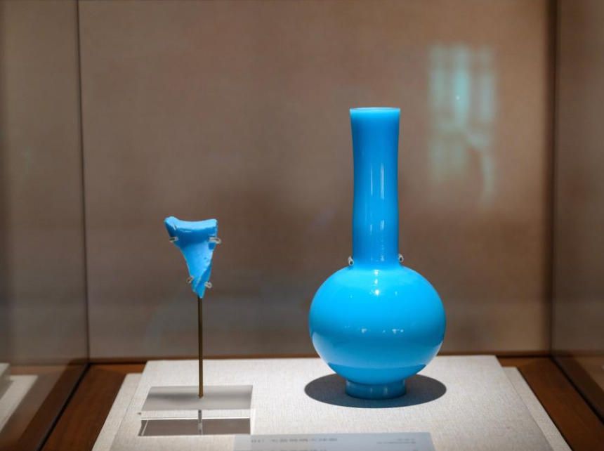这是展出的故宫造办处旧址出土的天蓝玻璃残片与故宫院藏清代天蓝玻璃天球瓶(11月3日摄)。(新华社)