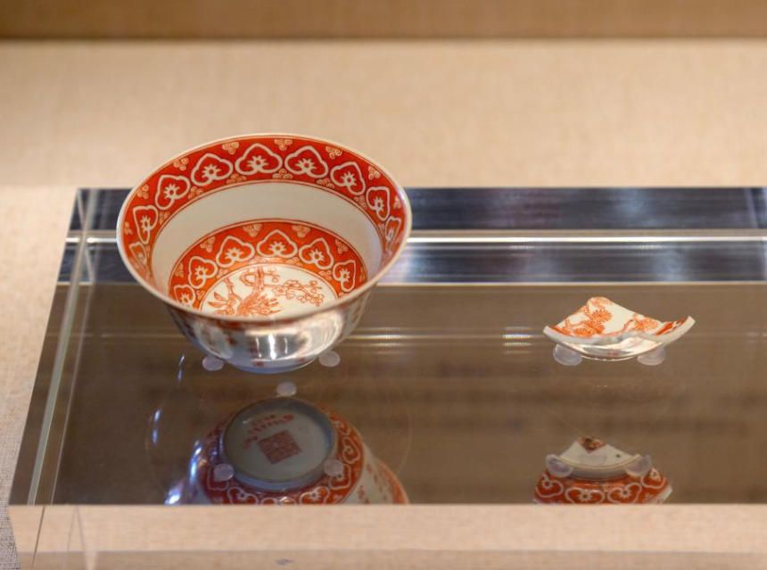 这是展出的故宫造办处旧址出土的白釉矾红彩三清茶碗残片与故宫院藏清代白釉矾红彩三清茶碗(11月3日摄)。(新华社)