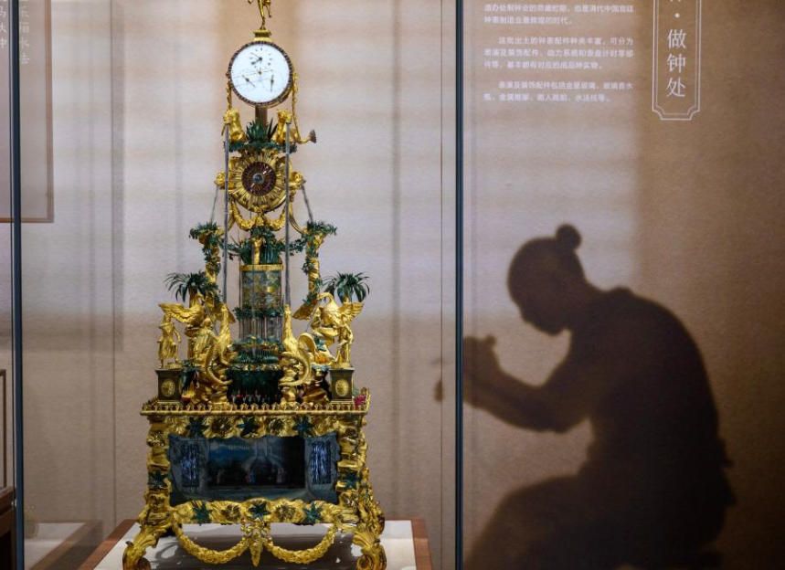 这是展出的铜镀金乐箱水法跑人双马驮钟(11月3日摄)。(新华社)
