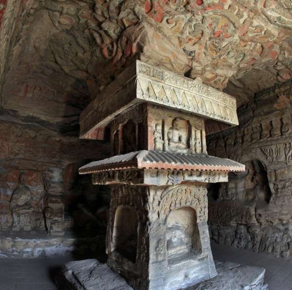 山西云冈石窟第1窟的中心柱塔。(图/中新社)