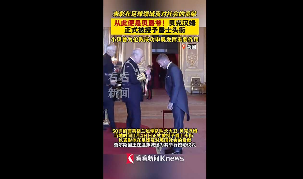 足坛名宿贝克汉姆4日正式被授予爵士头衔,以表彰他在足球及对英国社会的贡献。(图/上海看看新闻视频截图)