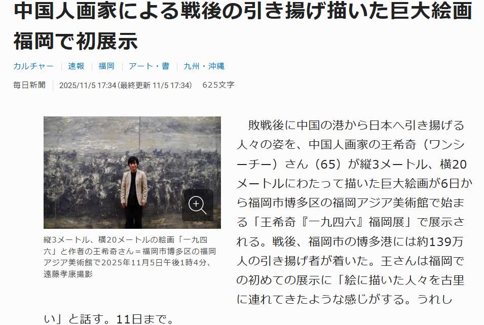 中国画家王希奇(65岁)创作的高3米、长20米的巨幅画作《一九四六》6日起在福冈亚洲美术馆(福冈市博多区)举办的“王希奇《一九四六》福冈展”中展出。该画作描绘了战败后日本侨民从中国港口登船返回日本的场景。据悉,战败后约139万侨民从福冈市的博多港登陆返日。这是王希奇的作品首次在福冈进行展览。他表示,“感觉就像把画中的人们带回了故乡一样,非常高兴”。该展览将持续至11月11日。