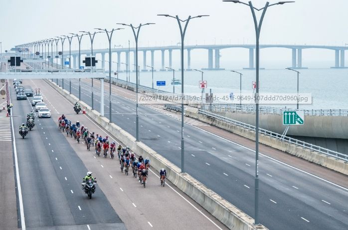 2024年11月24日,十五运会公路自行车测试赛的参赛选手经过港珠澳大桥香港赛段。(图/中新社)