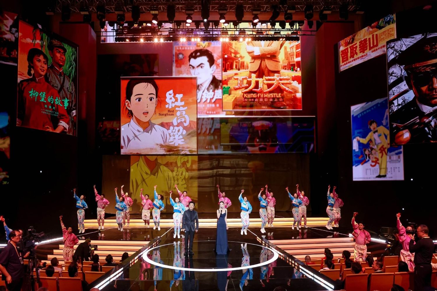 开幕式上,演员黄渤、周冬雨点亮金鸡。据悉,今年开幕式的“点亮金鸡”环节采用中国国内少见的超大飞幕装置,回归电影银幕概念,并让120幅人工智能生成的经典电影专属海报在屏幕上浮现,汇成中国电影发展的壮阔图景。